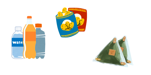 飲み物は多めに! おにぎりやパンなど、片手で食べられる軽食も用意しておきましょう。